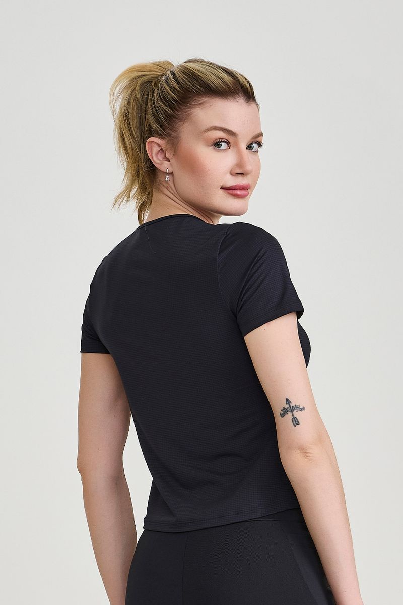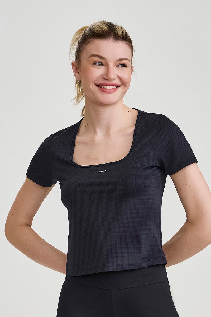 Blusa Texturizada Dry Preta — Confeccionada em tecido tecnológico dry respirável, esta blusa preta une desempenho e design minimalista. O decote quadrado confere sofisticação, enquanto o efeito quadriculado texturizado adiciona profundidade visual sem perder leveza. O tecido oferece respirabilidade e proteção contra raios UVA/UVB, ideal para treinos de corrida, musculação ou para a rotina urbana ativa. Modelagem reta com comprimento cropped, mangas curtas montadas e barra reta para um caimento confortável e versátil. Palavra-chave para busca: blusa fitness preta, blusa dry fit proteção UV, blusa decote quadrado.