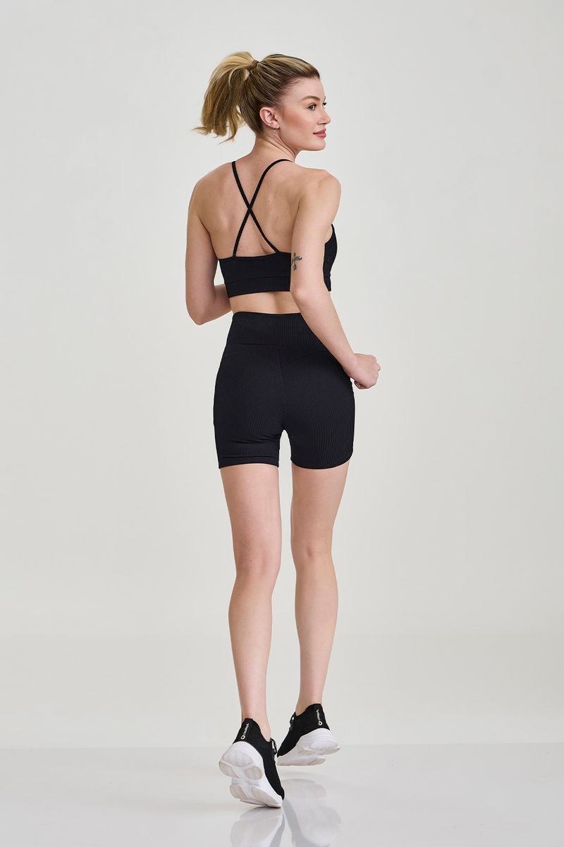 Short curto canelado preto 'Empina Bumbum' com cós alto e recorte modelador que valoriza a silhueta. Confeccionado em tecido canelado em relevo com toque macio, acabamento levemente brilhante e tecnologia de proteção solar, oferece suporte confortável e liberdade de movimento. Ideal para treinos, pilates e looks athleisure, traz acabamento premium e funcionalidade em um design versátil e contemporâneo.